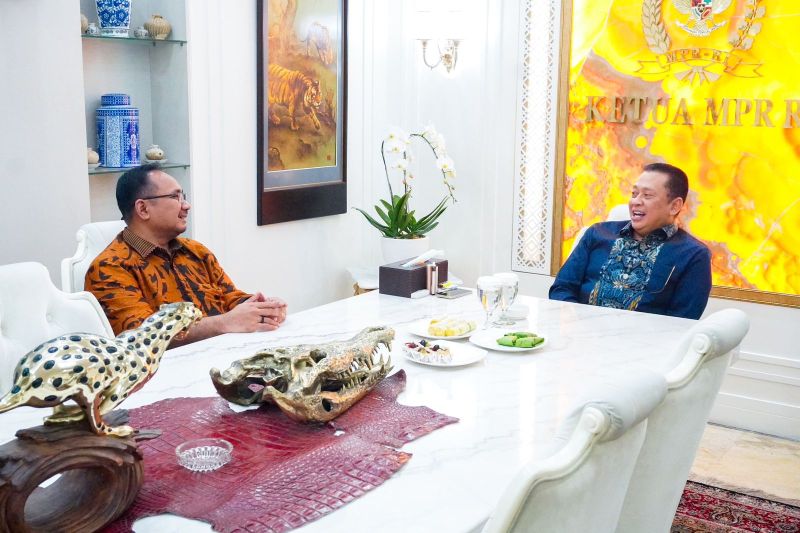 Ketua MPR RI Bambang Soesatyo alias Bamsoet bertemu dengan Menteri Agama (Menag) Yaqut Cholil Qoumas yang berkunjung ke …