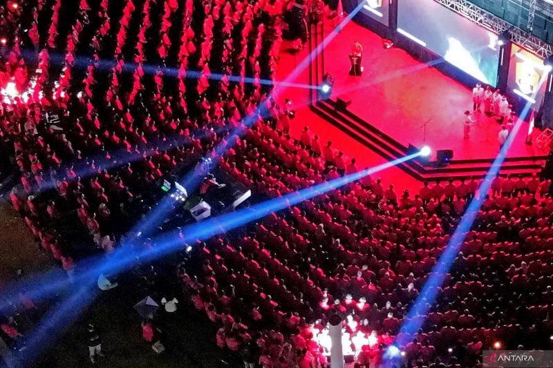 Foto udara sejumlah peserta mengikuti orasi kebangsaan saat pembukaan Ziarah Nasional Alumni dan Kader GMNI di kawasan …
