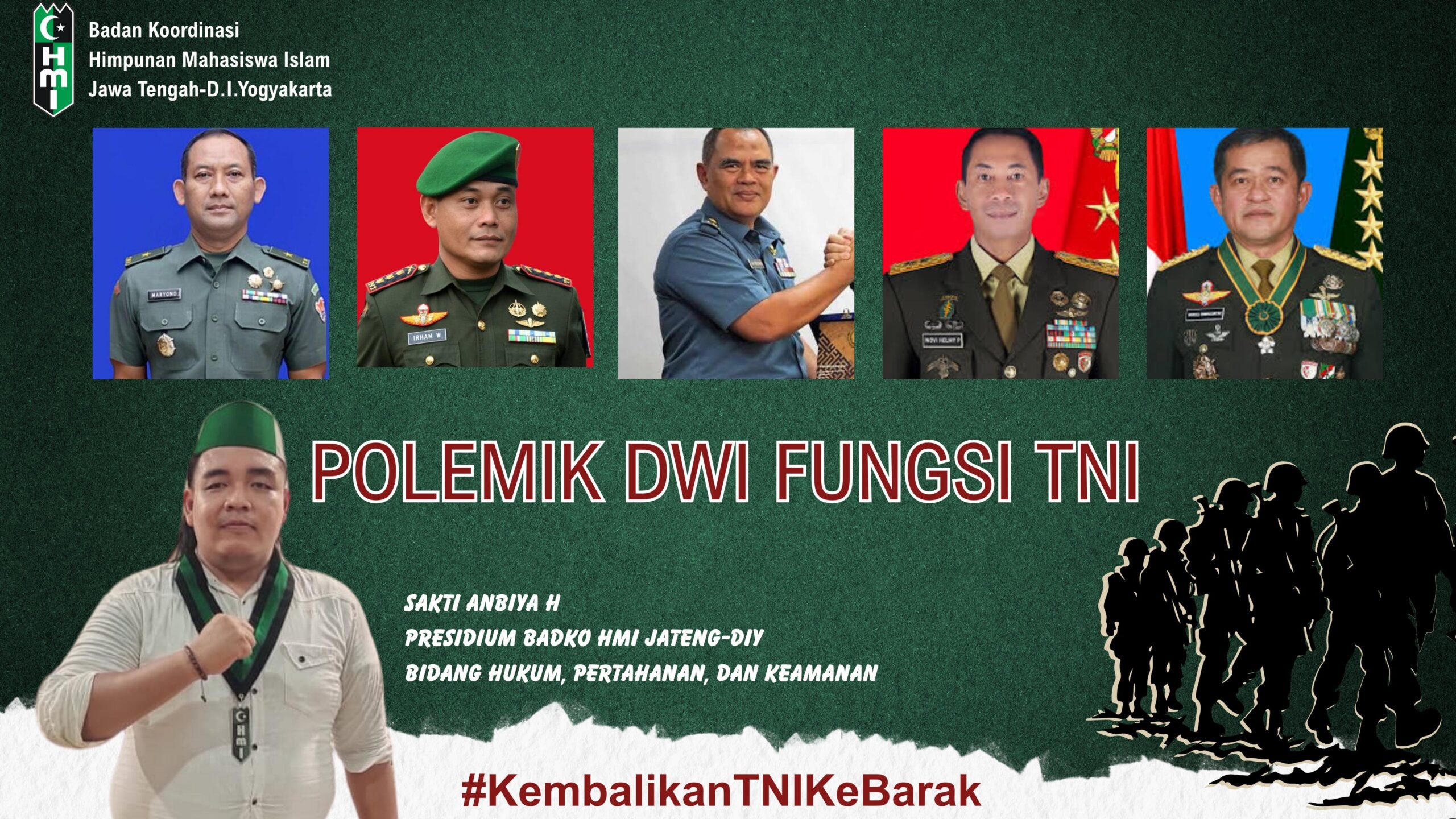 “Maka Badko HMI Jateng-DI Yogyakarta menolak dengan tegas segala bentuk tentara dalam menduduki jabatan sipil yang berpotensi mengembalikan Dwi fungsi TNI,” tandasnya.