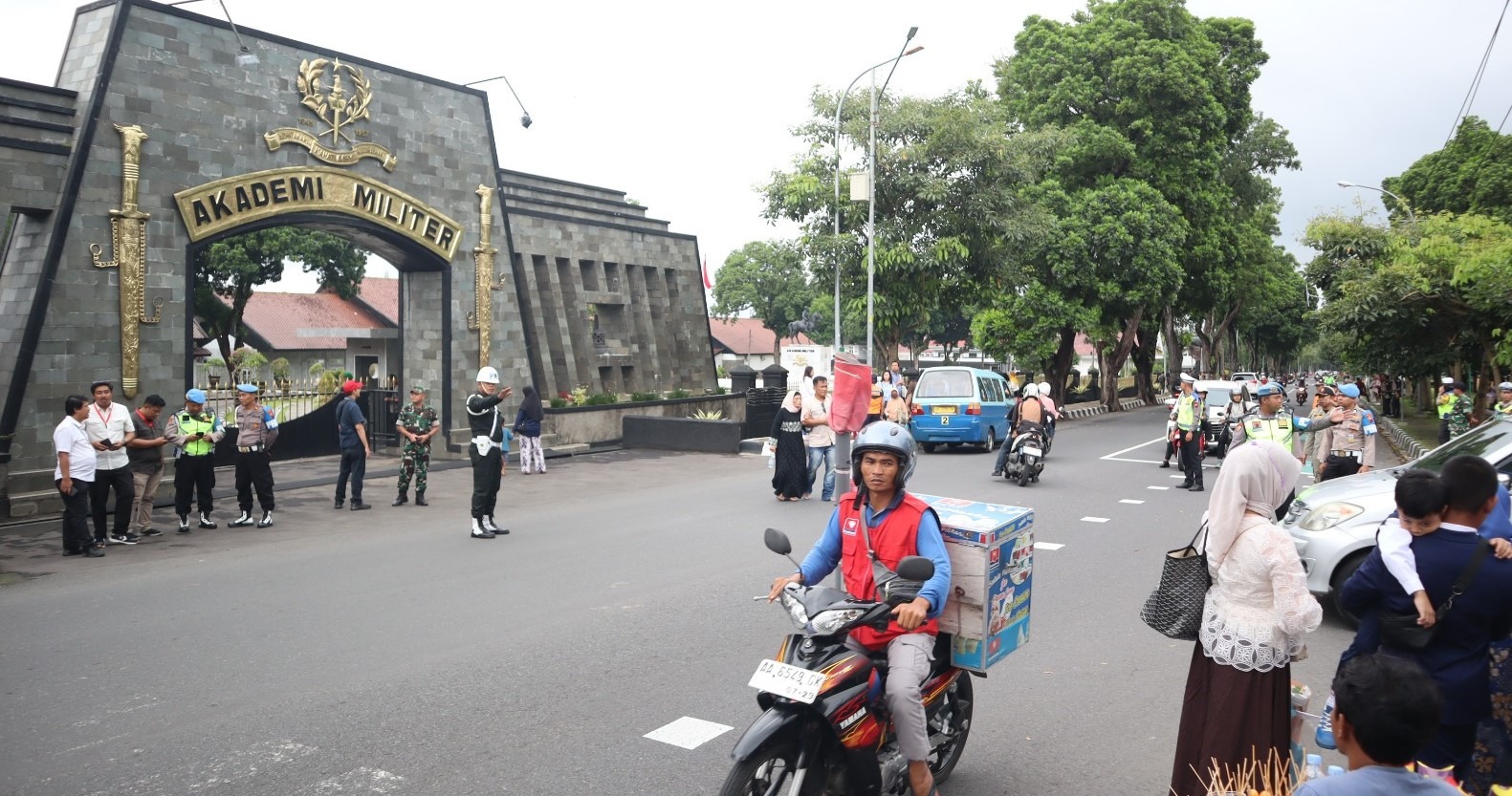 Tampak petugas dari unsur TNI, Polri, Dinas Perhubungan (Dishub), dan Satpol PP berjaga di depan pintu utama Akmil Magelang. Kehadiran personel gabungan tersebut menjadi garda terdepan dalam mengatur mobilitas para tamu undangan, orang tua taruna, serta masyarakat yang turut menyaksikan jalannya wisuda.