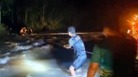 Personel Satgas Pamtas Statis RI-PNG Yonif 111/KB mengevakuasi dua warga Ulilin yang terseret arus akibat banjir di …