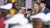 Presiden Joko Widodo (kiri) memeriksa pasukan saat menjadi inspektur upacara HUT Ke-78 Bhayangkara di Lapangan Monas, …
