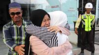Seorang pekerja migran Indonesia (PMI) yang dideportasi dari Malaysia berpelukan dengan anggota keluarganya di Terminal …