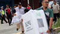 Sejumlah petugas membawa logistik Pemungutan Suara Ulang (PSU) Pemilu Legislatif 2024 menuju rumah ketua Kelompok …